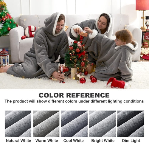This cozy wearable blanket hoodie offers comfort and warmth for both adults and children. Made with soft flannel and sherpa materials, it's perfect for relaxing on the sofa or watching TV.